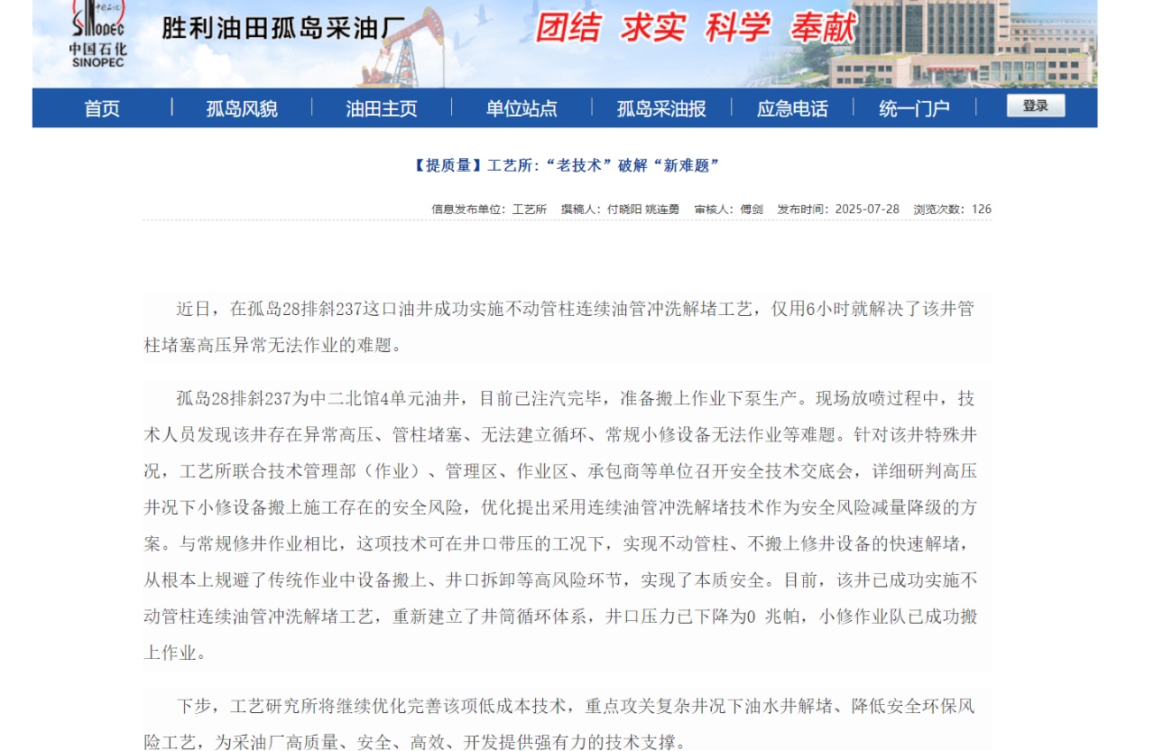 近日,九力连油针对孤岛28排斜237油井注汽后出现的异常高压、管柱堵塞等难题,联合多单位制定方案,采用不动管柱连续油管冲洗解堵技术,仅6小时便解决问题并实现本质安全,后续还将优化该技术以支撑采油厂高效开发。